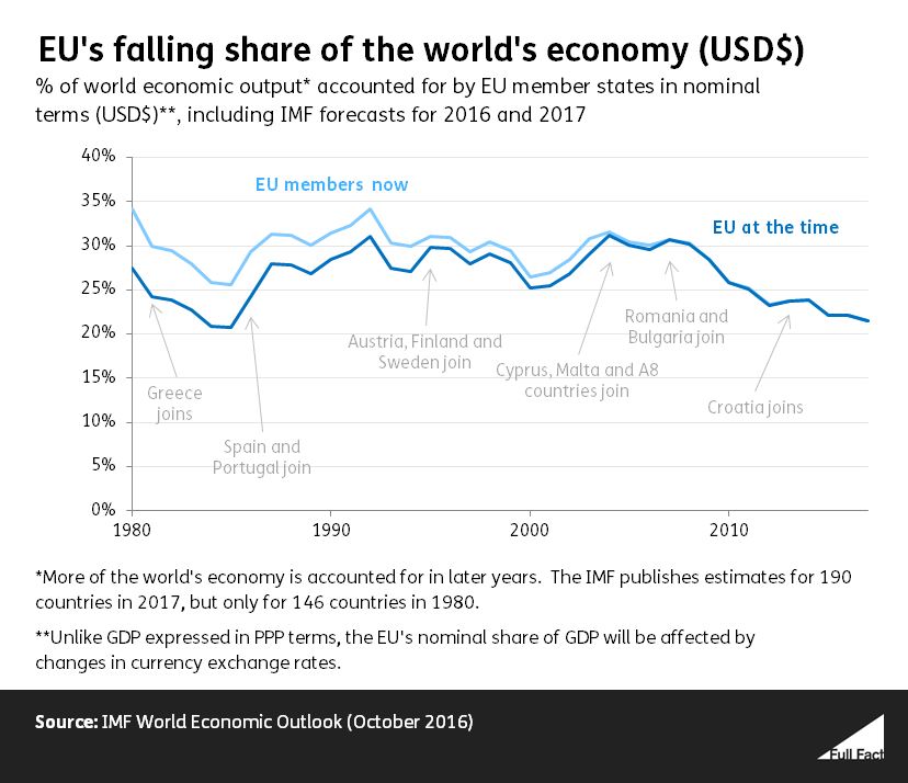 The graphs below show how the EU’s combined economy has shrunk relative to the world total; since new members joined in the period those economies have been added to give the pale-blue line. The graph on the left is in US dollars but this varies with exchange rates so a more realistic measure is generally used based on purchasing power within each economy.