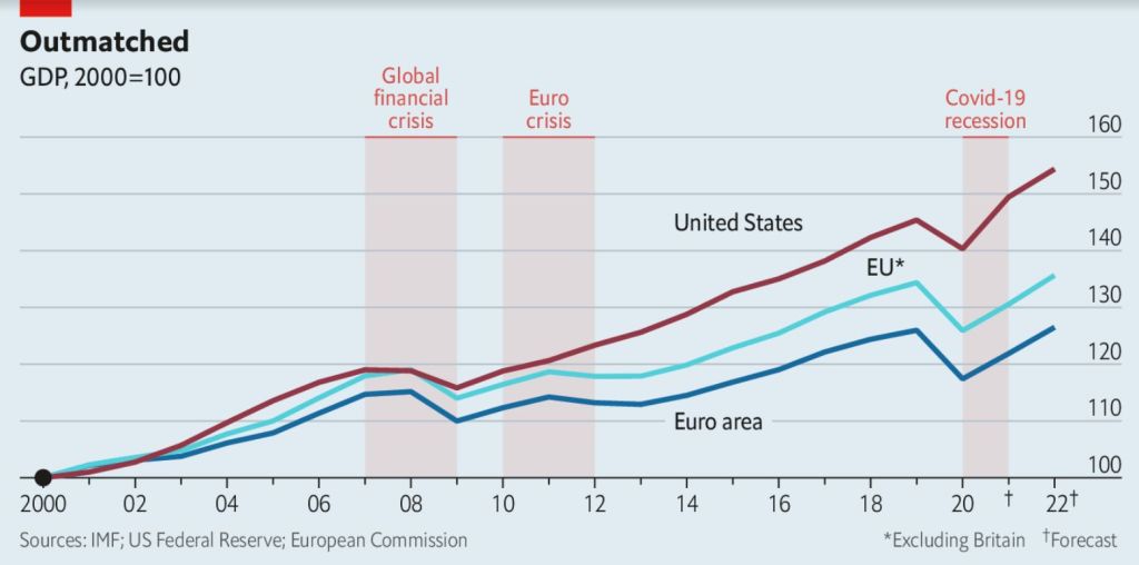 Given the relative poverty of some member nations, such as Bulgaria, the EU has a lot more headroom for growth than the US but manages far less, probably because it is a lumbering, bureaucratic, over-regulated coalition. Getting agreement by all states may also be part of the reason but ever greater centralisation (“more Europe“) doesn’t necessarily lead to quicker, better decision making. This was clear from the vaccine shambles. But the eurozone’s growth was even worse than the EU average (see graph below), perhaps because the centralisation of monetary policy by the ECB (and, effectively, of fiscal policy for Greece and some other states during the bailouts after the financial crisis) could have been handled better by the individual states, had they been left to make their own choices in their own best interests.