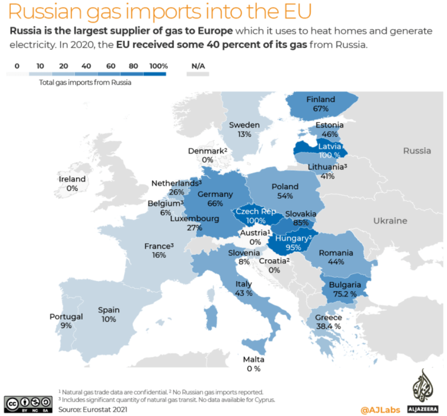 The US and UK have led the way with military support and anti-Russian sanctions to help Ukraine but many EU leaders are painfully aware of the moral turpitude and obvious contrast between its declared purpose and effective action if it doesn’t soon catch up. Guy Verhofstadt has urged the Union to get on with banning Russian gas, although his country, Belgium, is far less dependant on it than many other member states, it’s nearer to the UK’s level than Germany’s.
