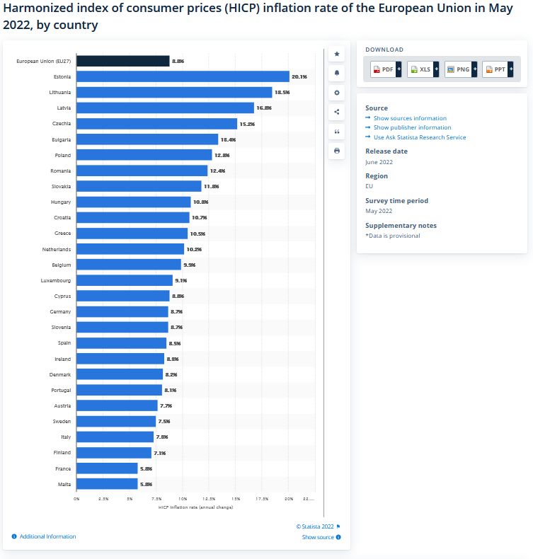 Would the UK as a member still be one of the better- or worse-performing economies in the Union or merely average? Comparing different economies can be difficult, consider inflation for example: The UK’s rate in May was 9.1%, slightly higher than the average for the EU at 8.1% . However, half the remaining member states had greater inflation than the UK, ranging up to 20%. In the other half, Germany’s dependence on Russian fuel could hit the country hard if it follows through (at last) on its noble words in support of Ukraine. Also in the lower half is France which currently generates about 70% of its electricity from nuclear energy but many of its generators are soon to face de-commissioning. These are two big contributors to the average inflation number for the whole Union which could swing it the other way. At the bottom of the list is Malta whose Finance Minister, Clyde Caruana, said: “The load is being felt by all European countries and most of these European governments are offloading the weight of the recession onto the people. It is as though they did not learn from previous recessions.” Malta subsidises fuel, energy and some goods, France also has taken measures to offset inflation. The UK has several measures of inflation (CPI, RPI, etc.), do all countries use comparable methods?